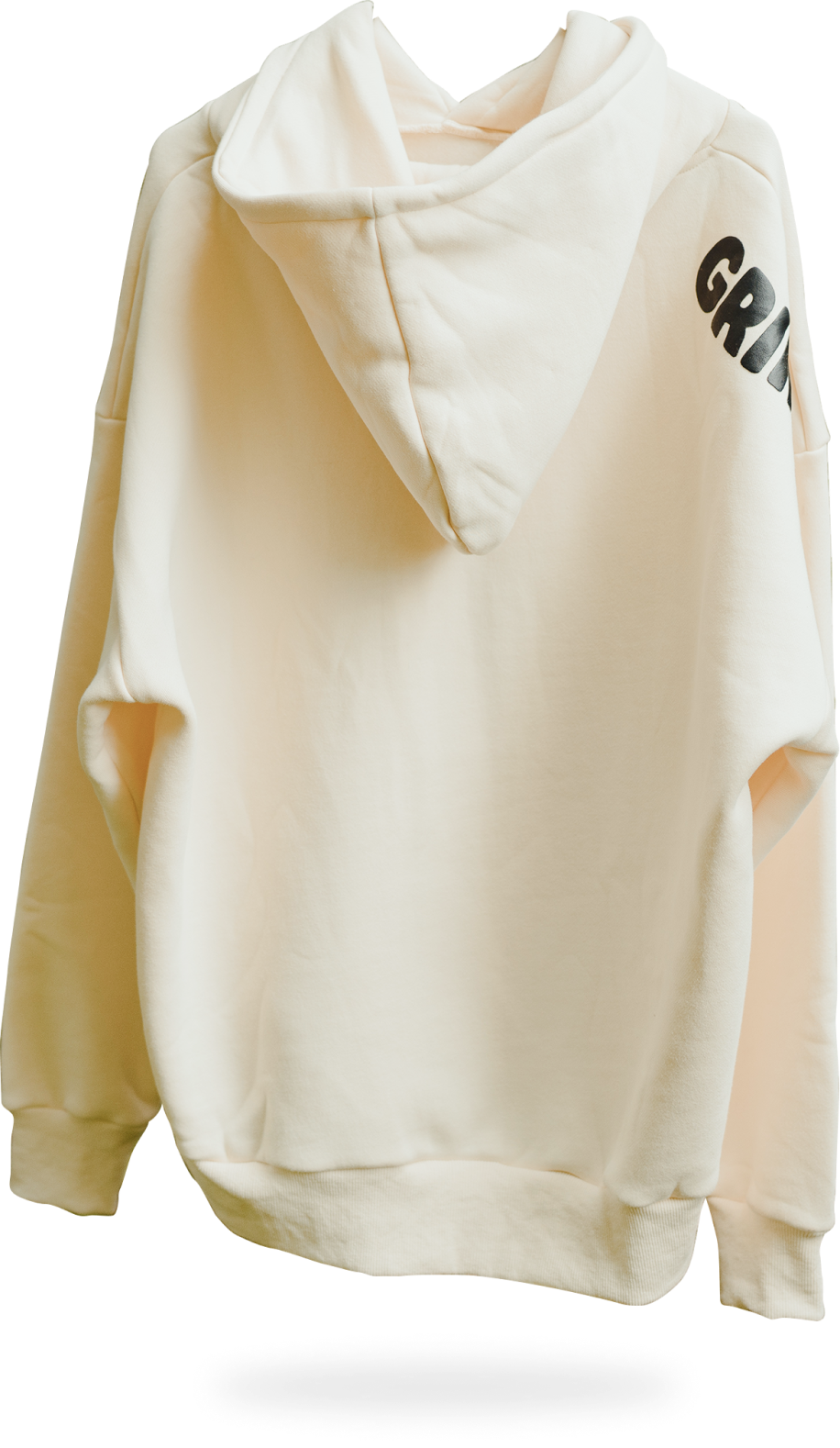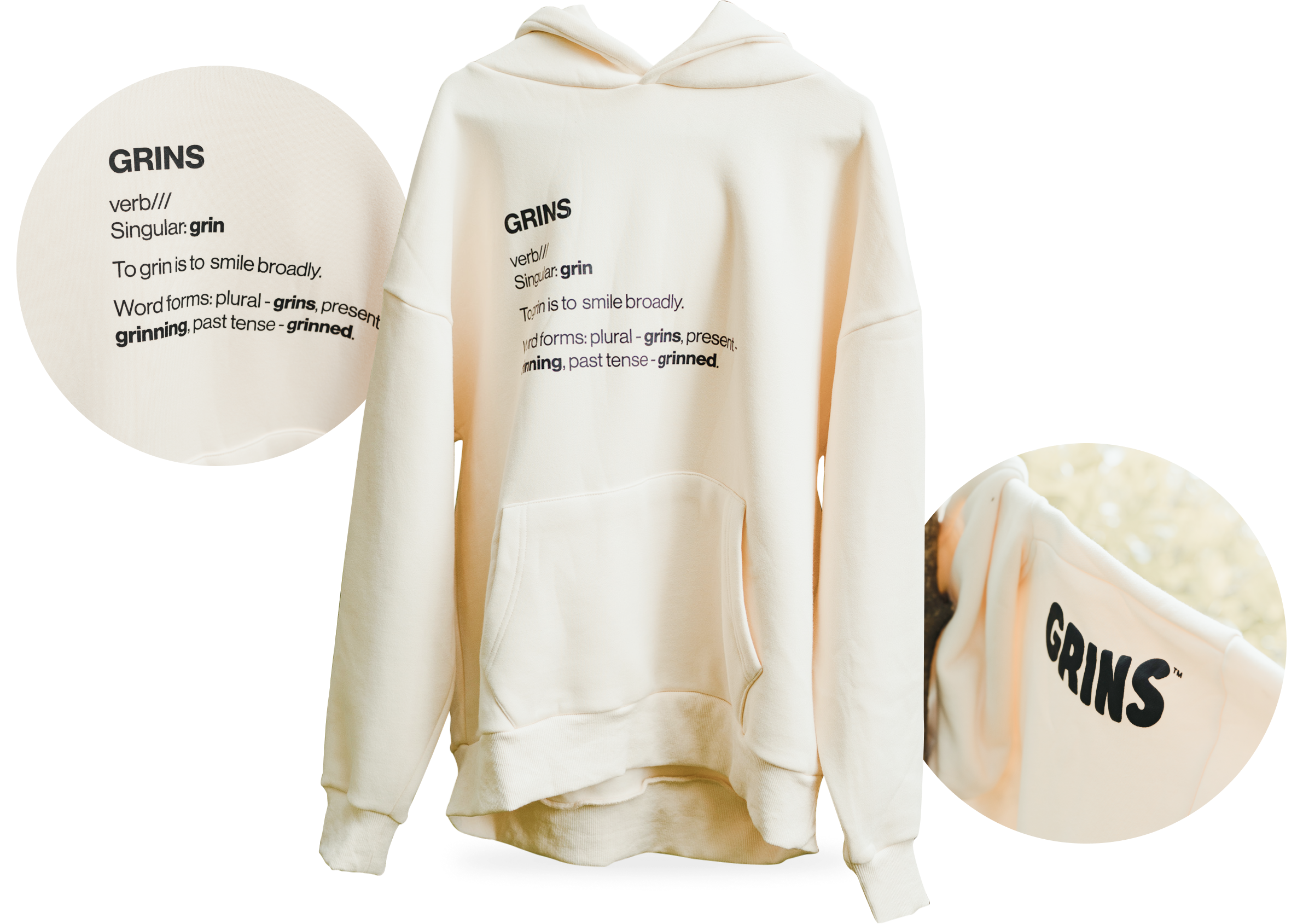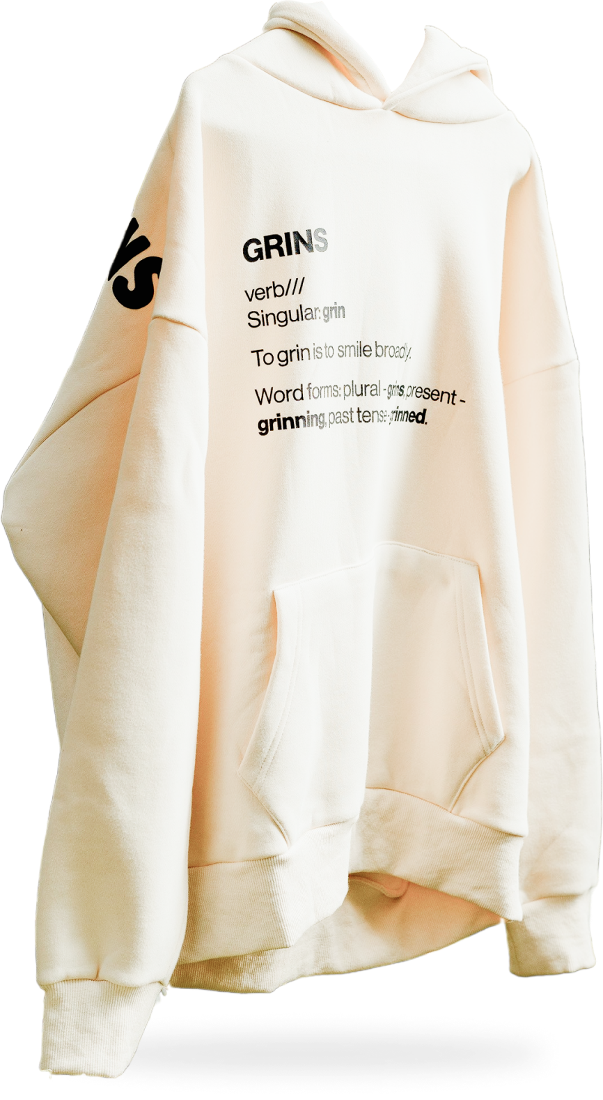 It's our first-ever heavyweight cotton pullover hoodie. Definition text on the chest and Grins logo behind the right shoulder. It comes in Beige, which looks snazzy on you. Different sizes available.